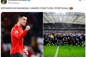 C罗本场因停赛缺席,他在比赛结束后也在社媒晒出全队合影,配文写道:“我们晋级世界杯了!加油,葡萄牙!”