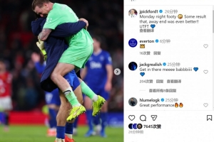 皮克福德社媒晒出庆祝的照片,配文:“周一足球之夜,这样的结果太棒了,客场看台的氛围更是无敌,加油埃弗顿!”